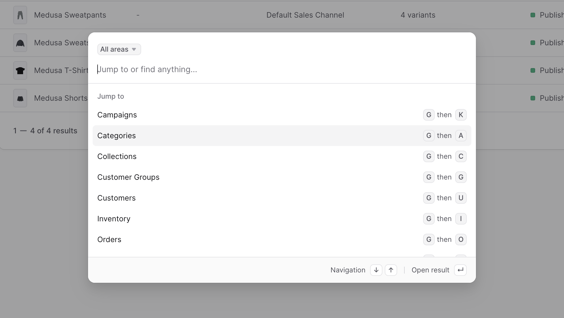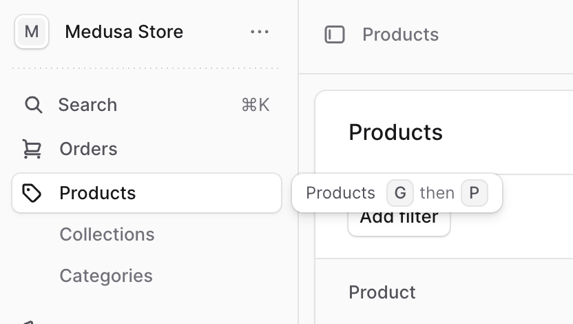 Sidebar items have shortcuts. For example, the Products page has a G then P shortcut. To view the shortcut of an item, hover your mouse for a few seconds and a tooltip will appear with the shortcut.You can also find all shortcuts by clicking on your profile item at the bottom of the sidebar and choosing “Shortcuts”.