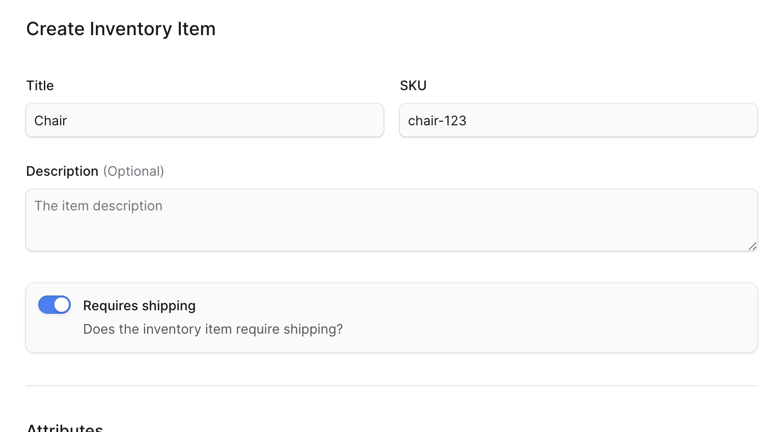 If the inventory item shouldn’t be shipped when its variant is purchased, toggle off the “Requires shipping” option. This is useful when the inventory item is a digital product, for example.