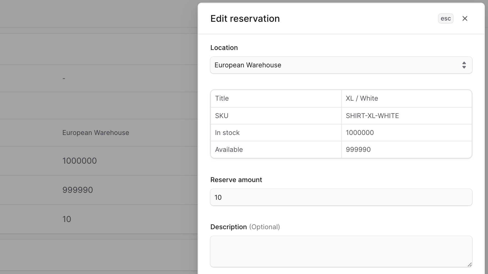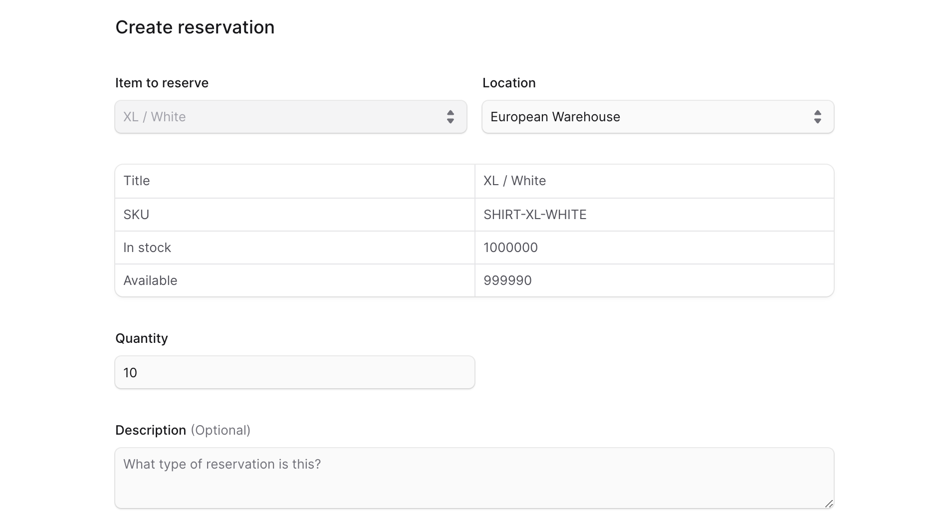The table above the field shows you how many available quantities of the item in the chosen location. When you make changes to the Quantity field, the availability will be updated in the table to reflect the change.