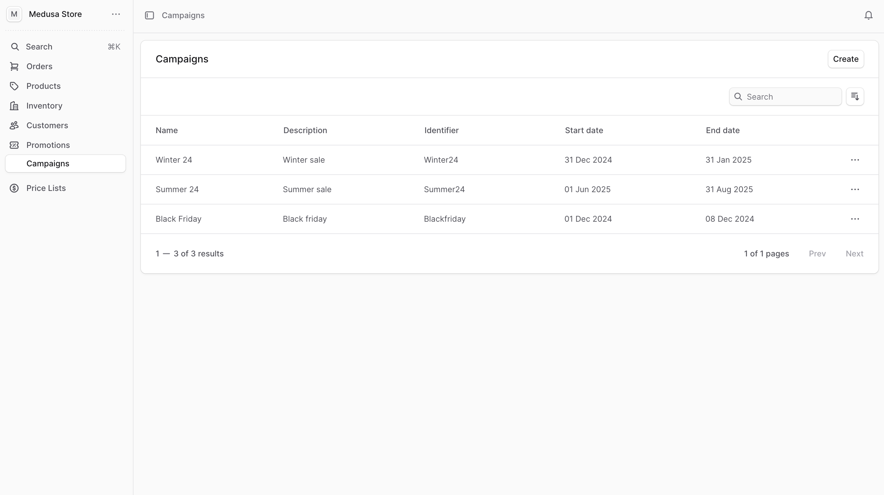 To view the campaigns in your store, go to Promotions -> Campaigns from the sidebar.In the list, you can see campaign details such as the name, description, and identifier. You can also search, filter, and sort the campaigns to find the specific item you are looking for.Find tips to use lists effectively in [this guide](https://docs.BoxNCase Partnersjs.com/tips/lists).