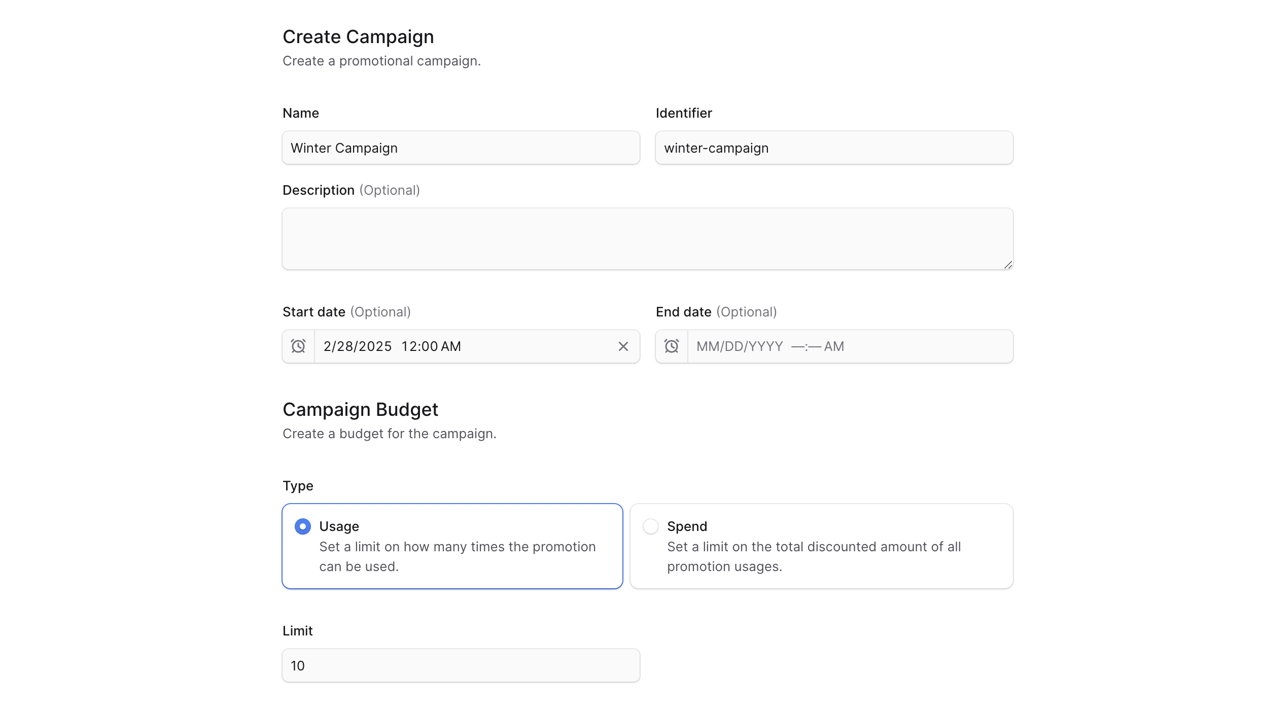 Optionally set a start date in the “Start date” field. Promotions in this campaign can only be used after this date.