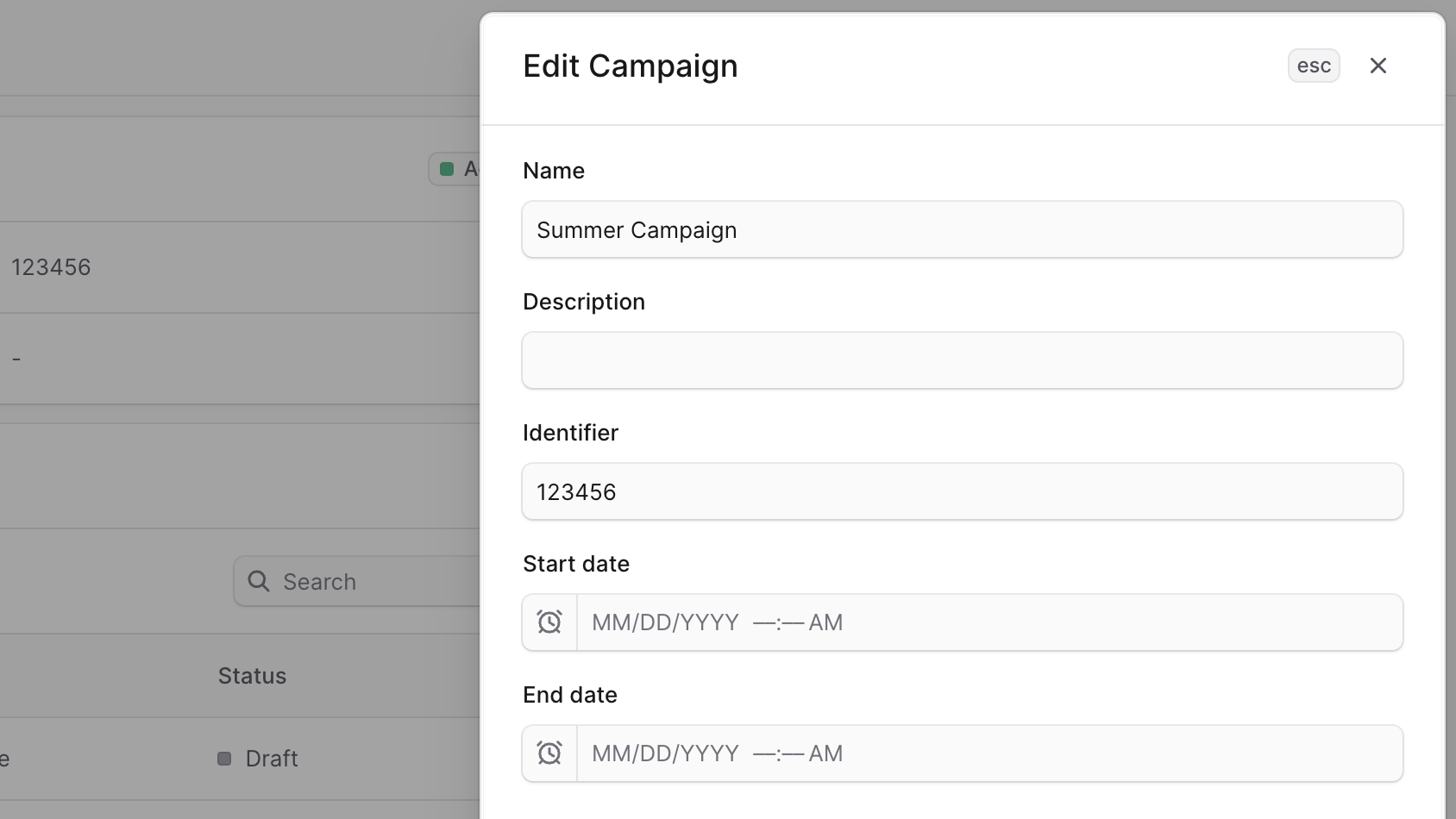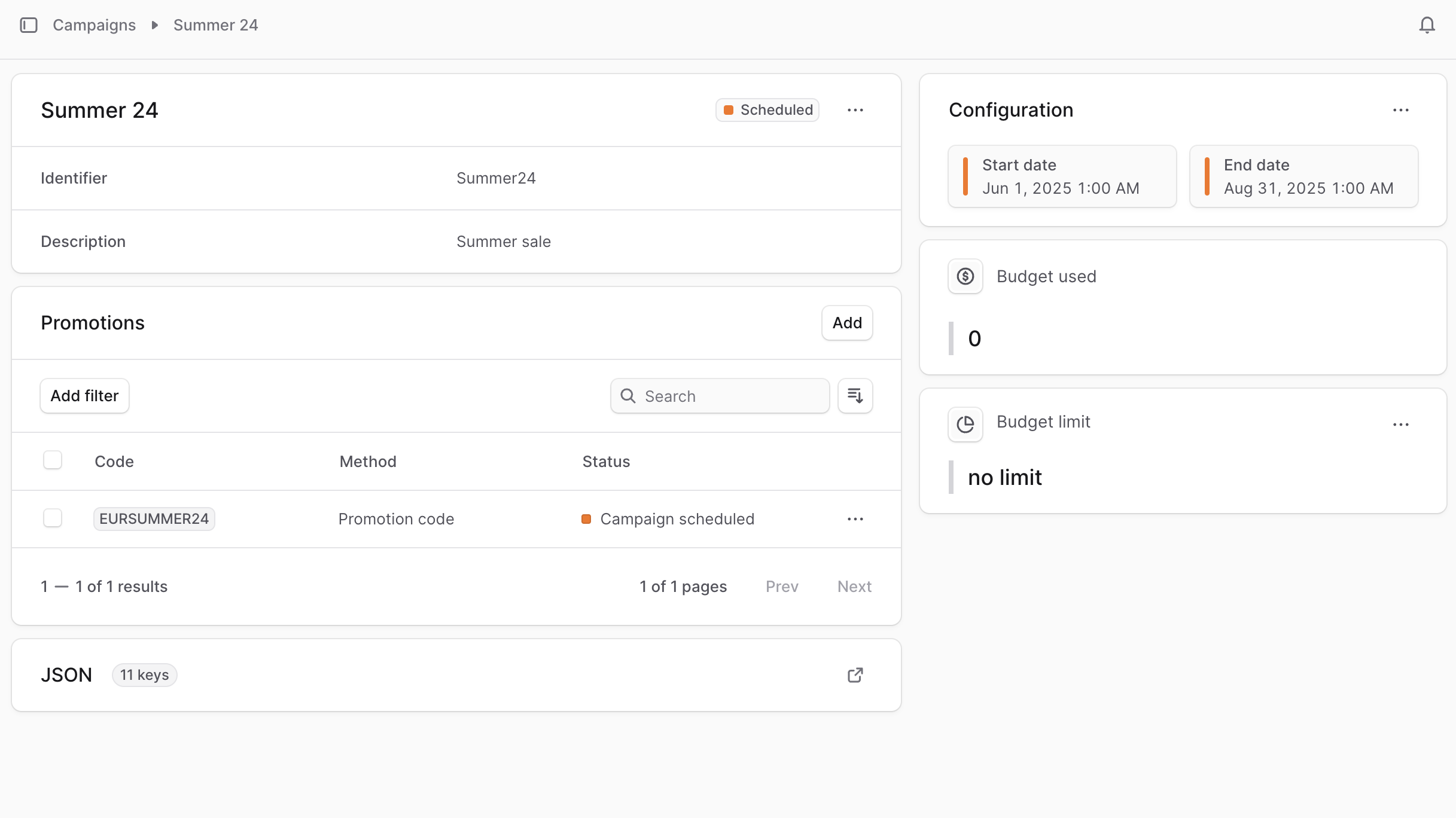 A campaign is a strategic collection of promotions designed to achieve specific marketing or sales objectives. Campaigns provide granular control over promotion usage, allowing you to establish start and end dates, budget limits, and usage constraints. When budget or usage limits are exceeded, all promotions within the campaign automatically expire.