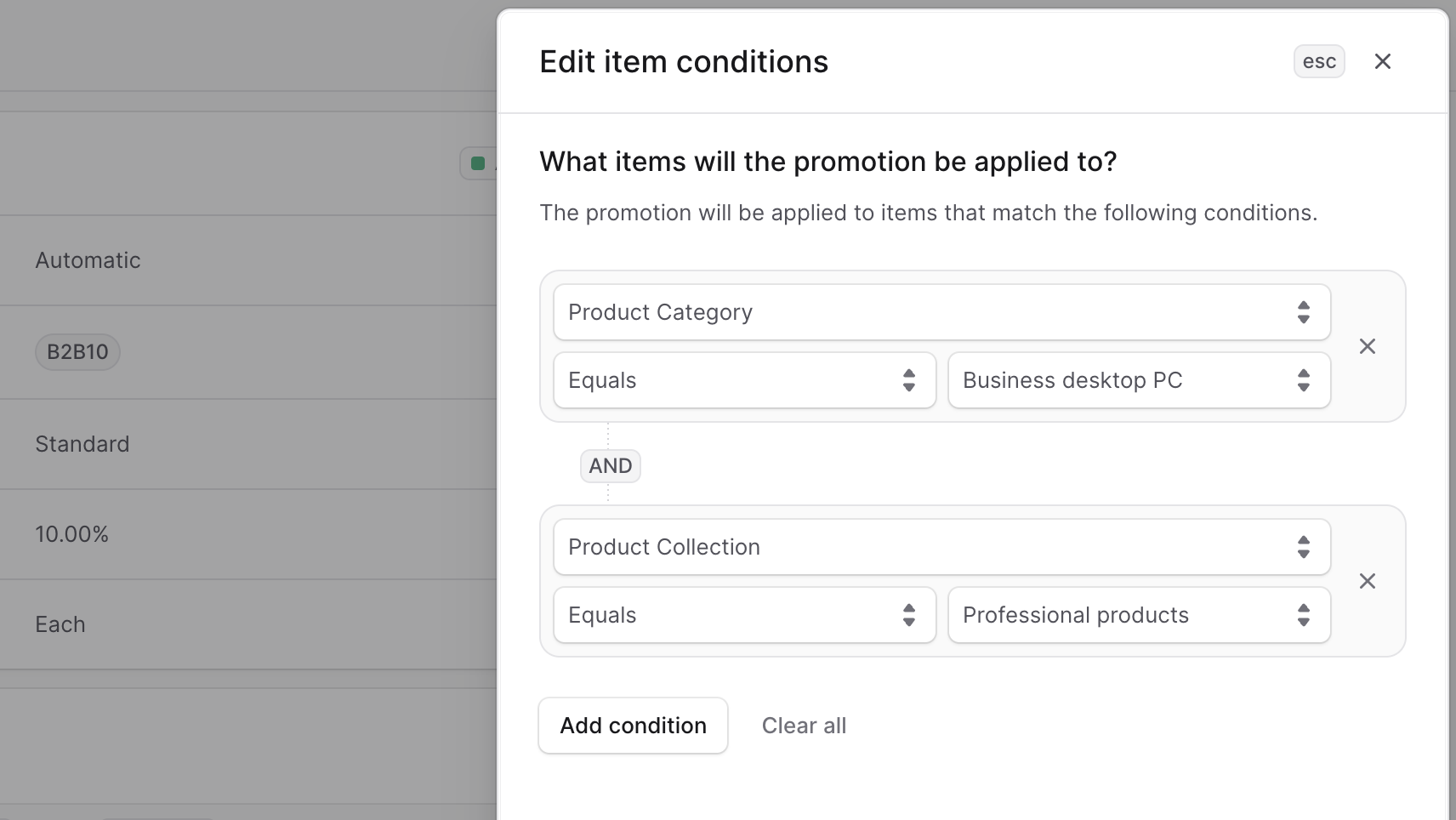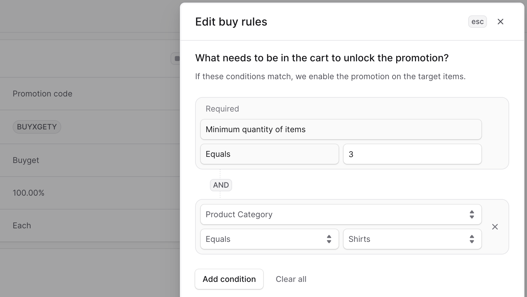 In the side window, you can edit the minimum required quantity of the product in the “Buy X” condition, and any other existing conditions. You can also add new conditions by clicking the “Add condition” button. For each condition: