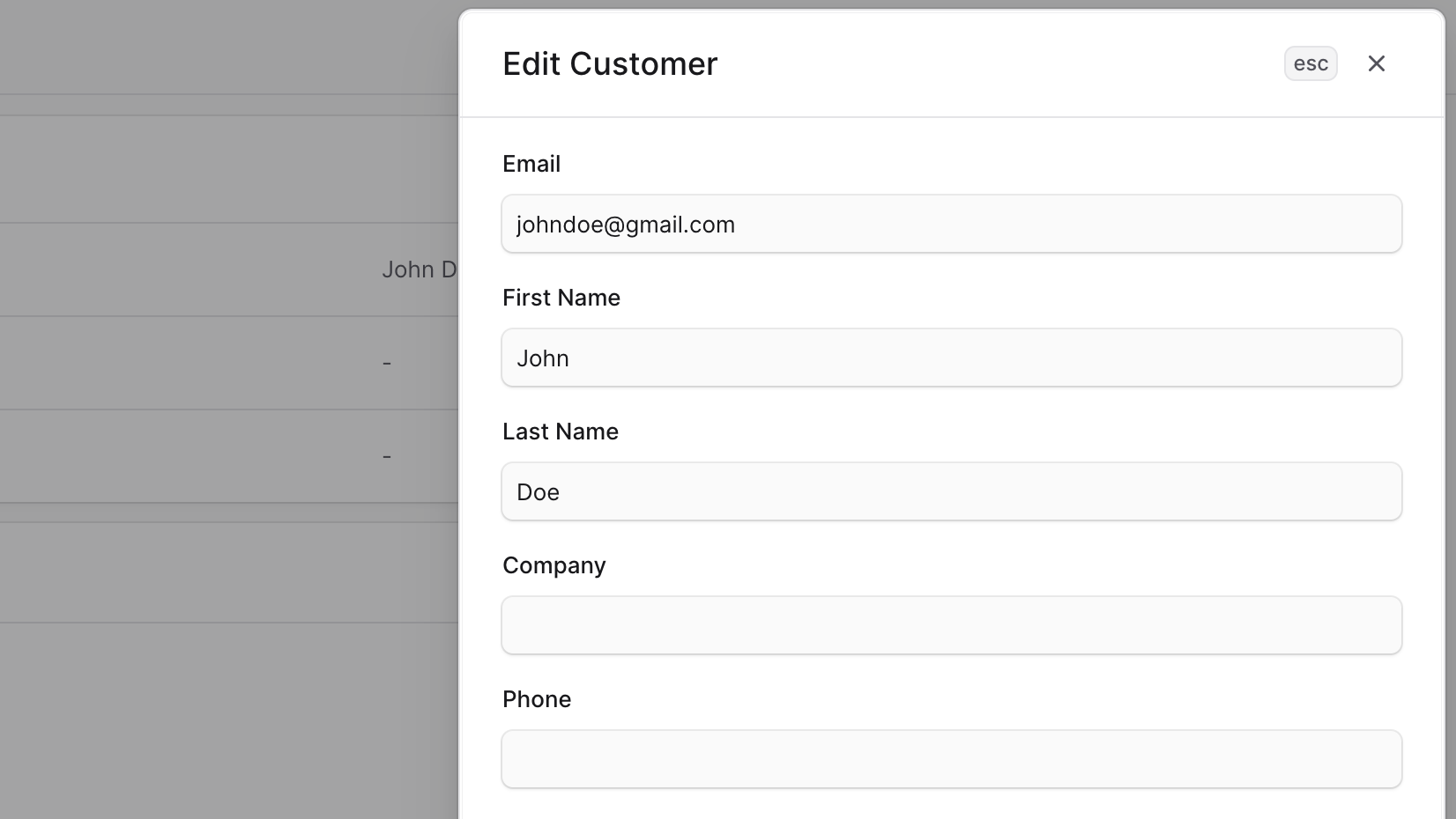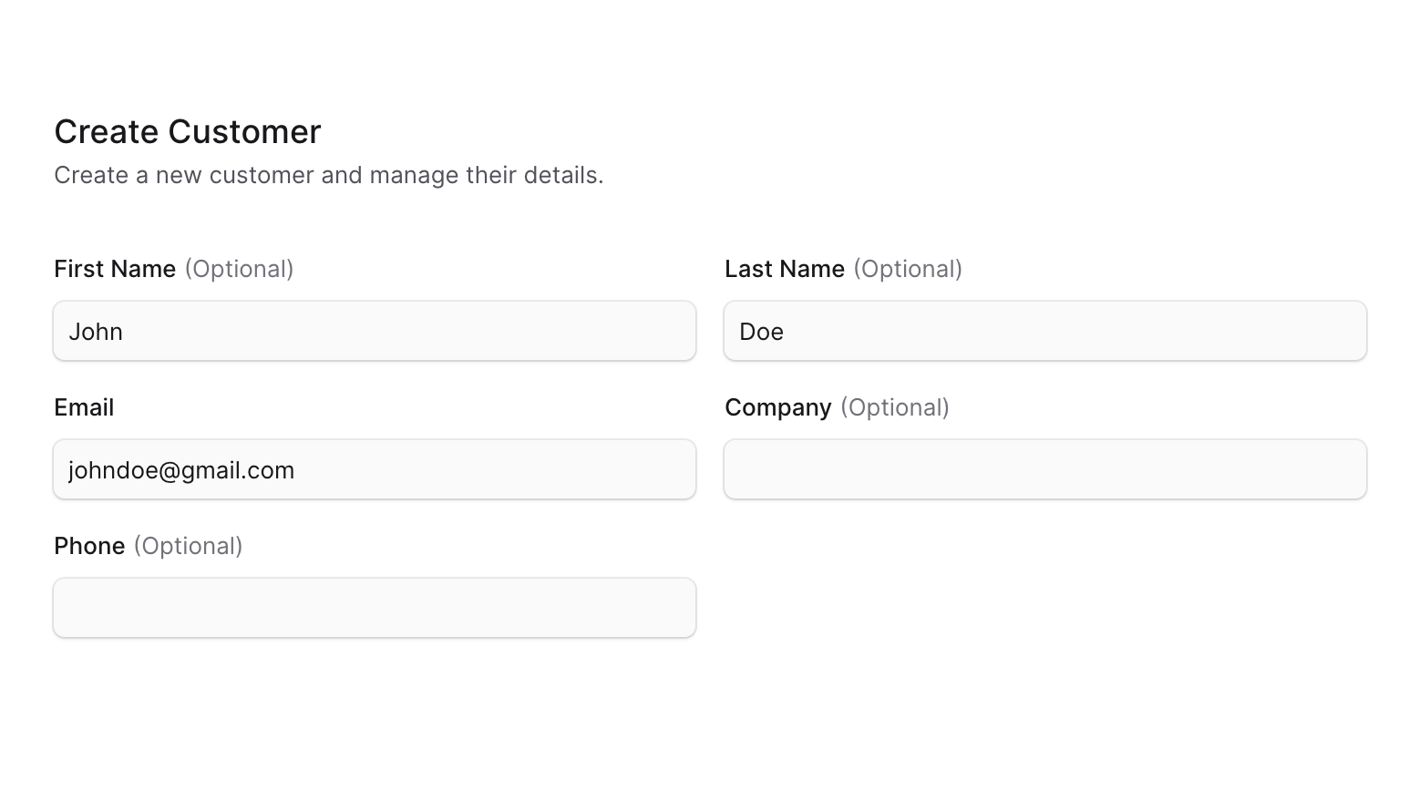 In the form that opens, enter the customer’s email, and optionally their first and last name, company name, and phone number.
