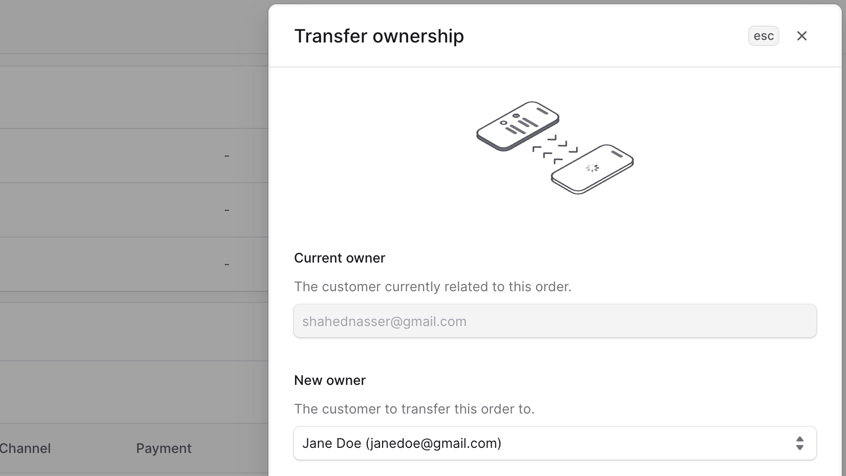 You can transfer an order to another customer. For example, a guest customer registered, or a customer created an order offline.When you transfer the ownership of an order, the original customer will receive a notification, such as an email, requesting their approval for the transfer. The order is transferred to the new customer only after the original customer approves the transfer.You can’t transfer ownership to a guest customer, and that includes customers you create through the admin dashboard.To transfer a customer’s order ownership to another: