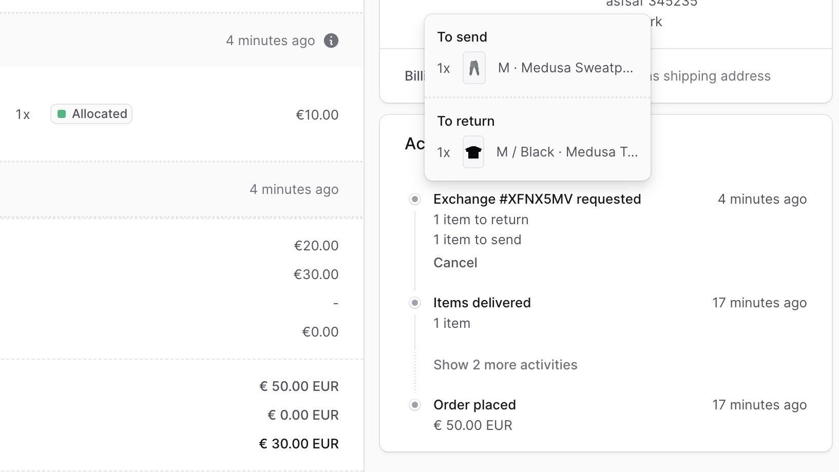 After items have been delivered to the customer, you can create an exchange where the customer returns the items and you send them a new one. Order exchanges are useful if the customer received an incorrect item or they changed their mind about the item they purchased, and you want to offer them a replacement.