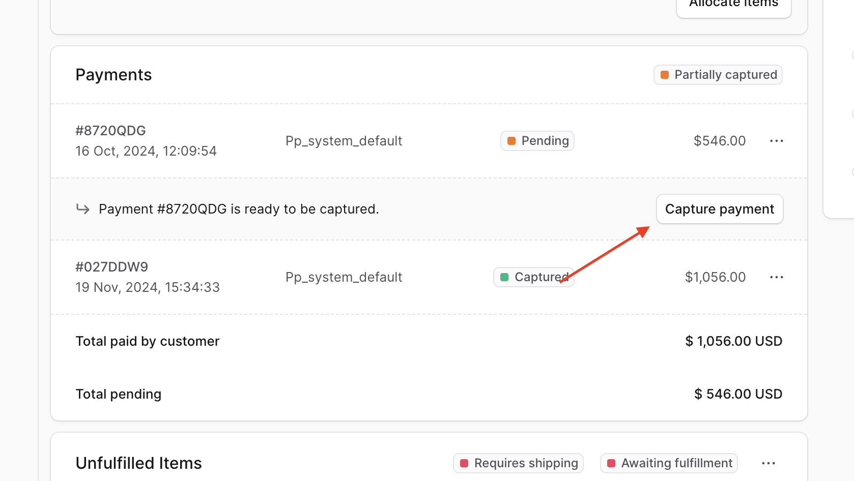 Once captured, the payment status will update to “Captured” and the funds will be processed by your payment provider.