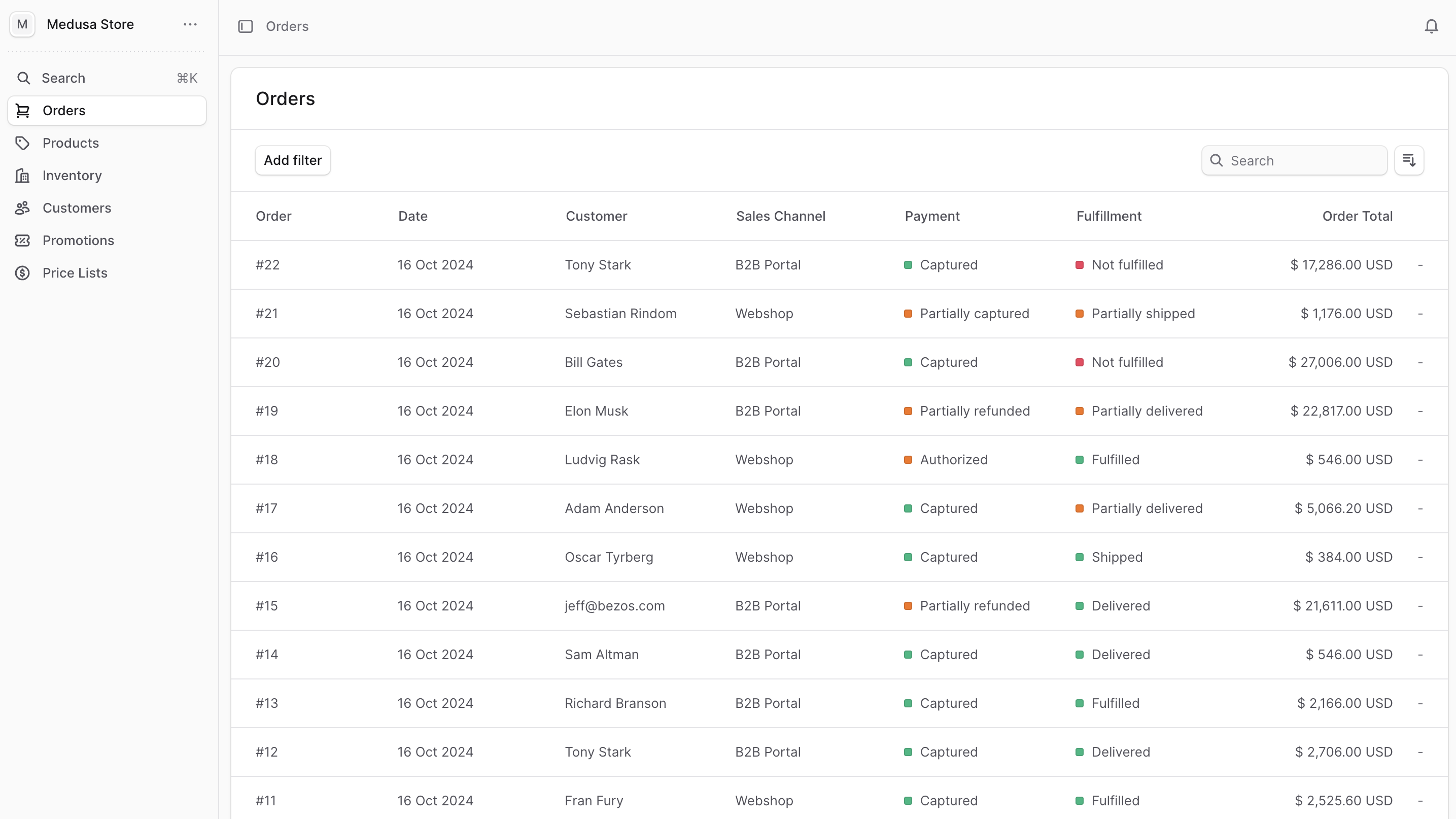 The Orders domain is where you’ll manage all the orders in your store coming through different channels. You can view an order’s information, capture payment, create shipments and fulfillments, register returns or exchanges of the order, and more