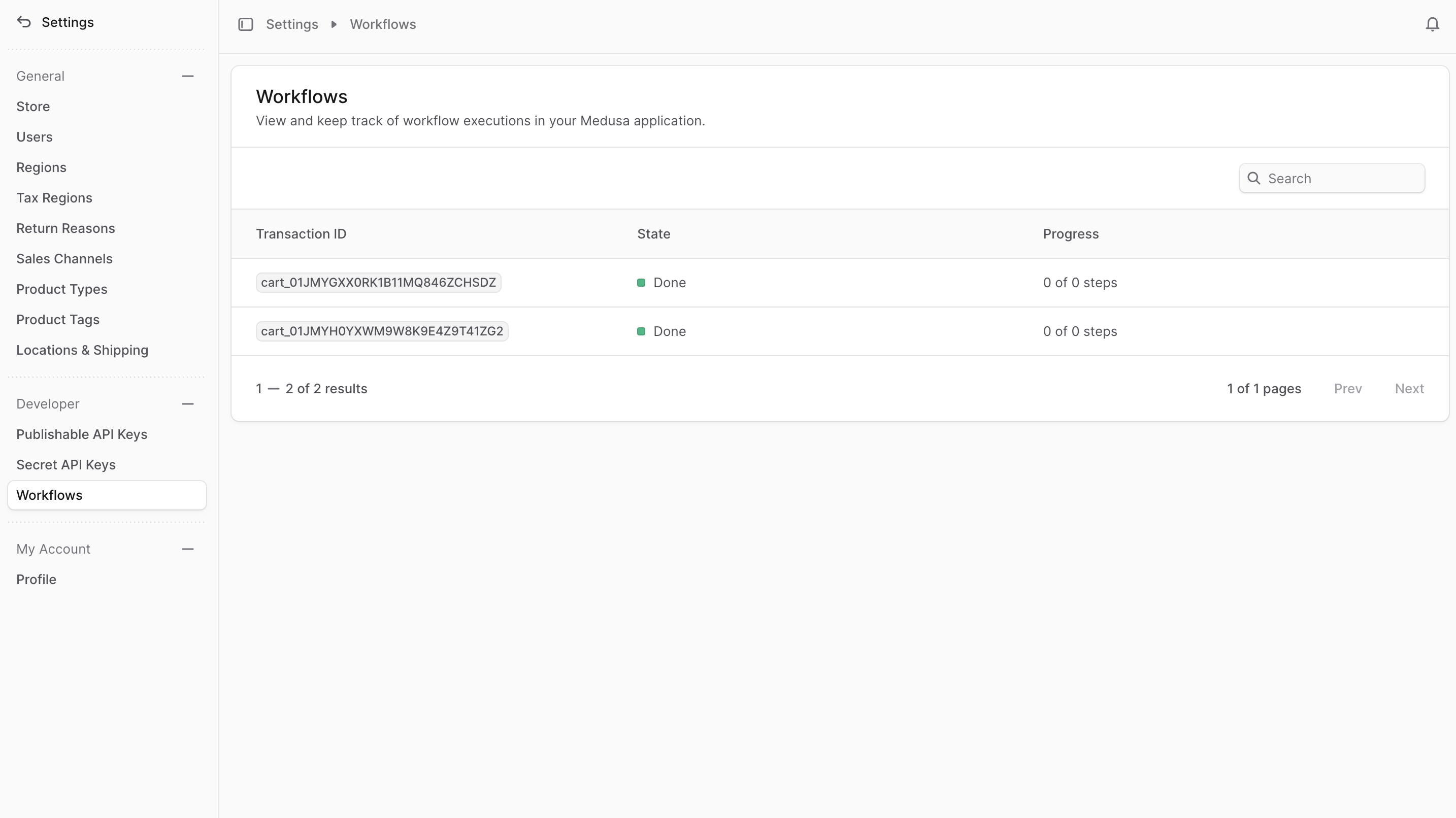 To view workflow executions, go to Settings → Workflows. There, you’ll find the list of custom and BoxNCase Partners workflows that have been executed and are stored in the database. You can search through the list to find the one you’re looking for.