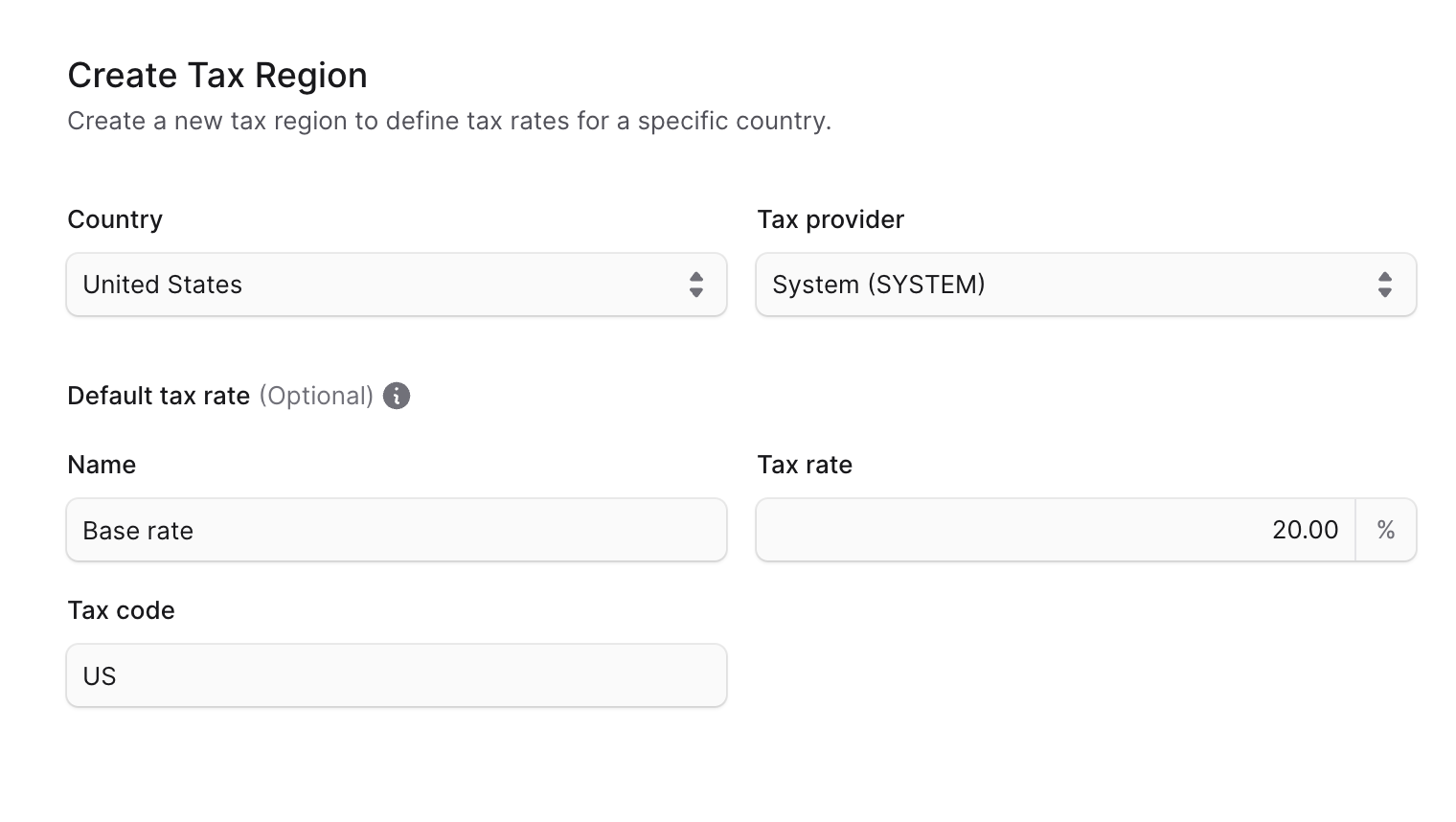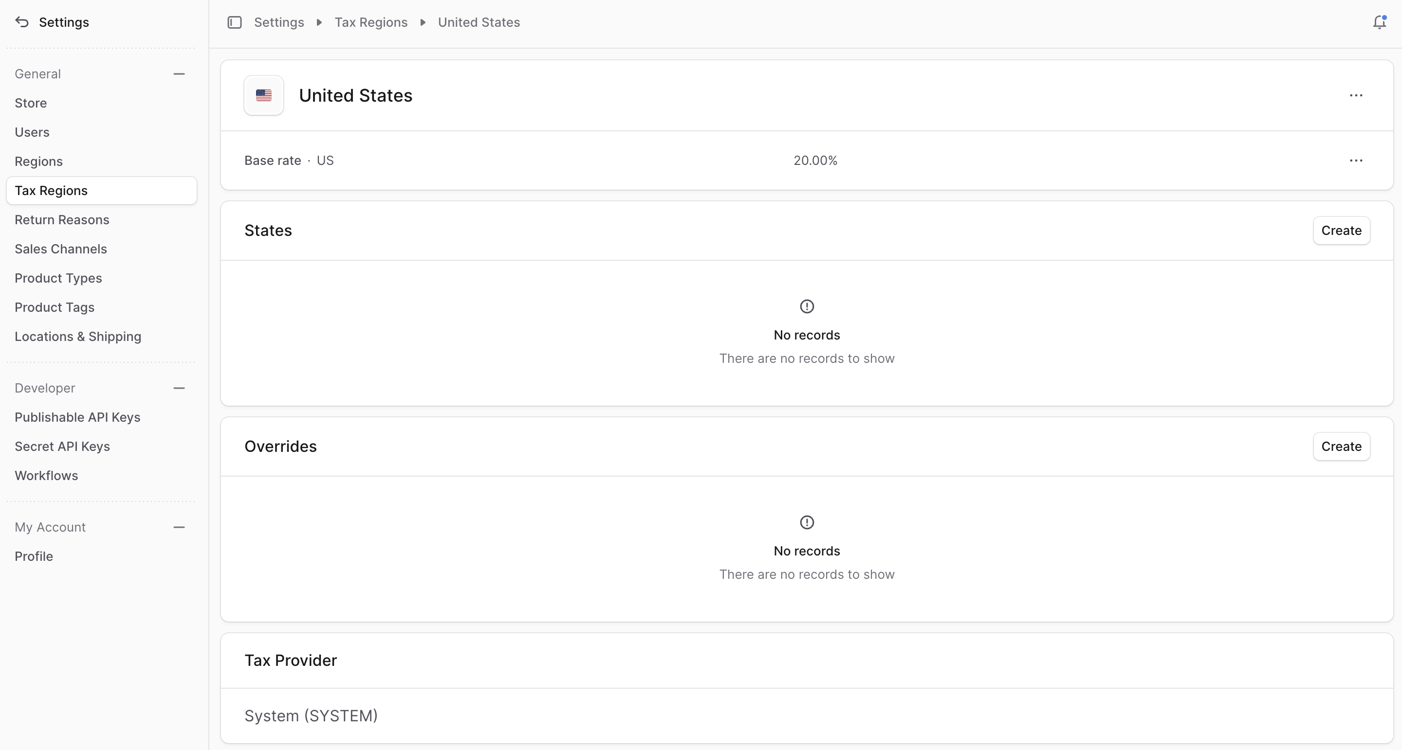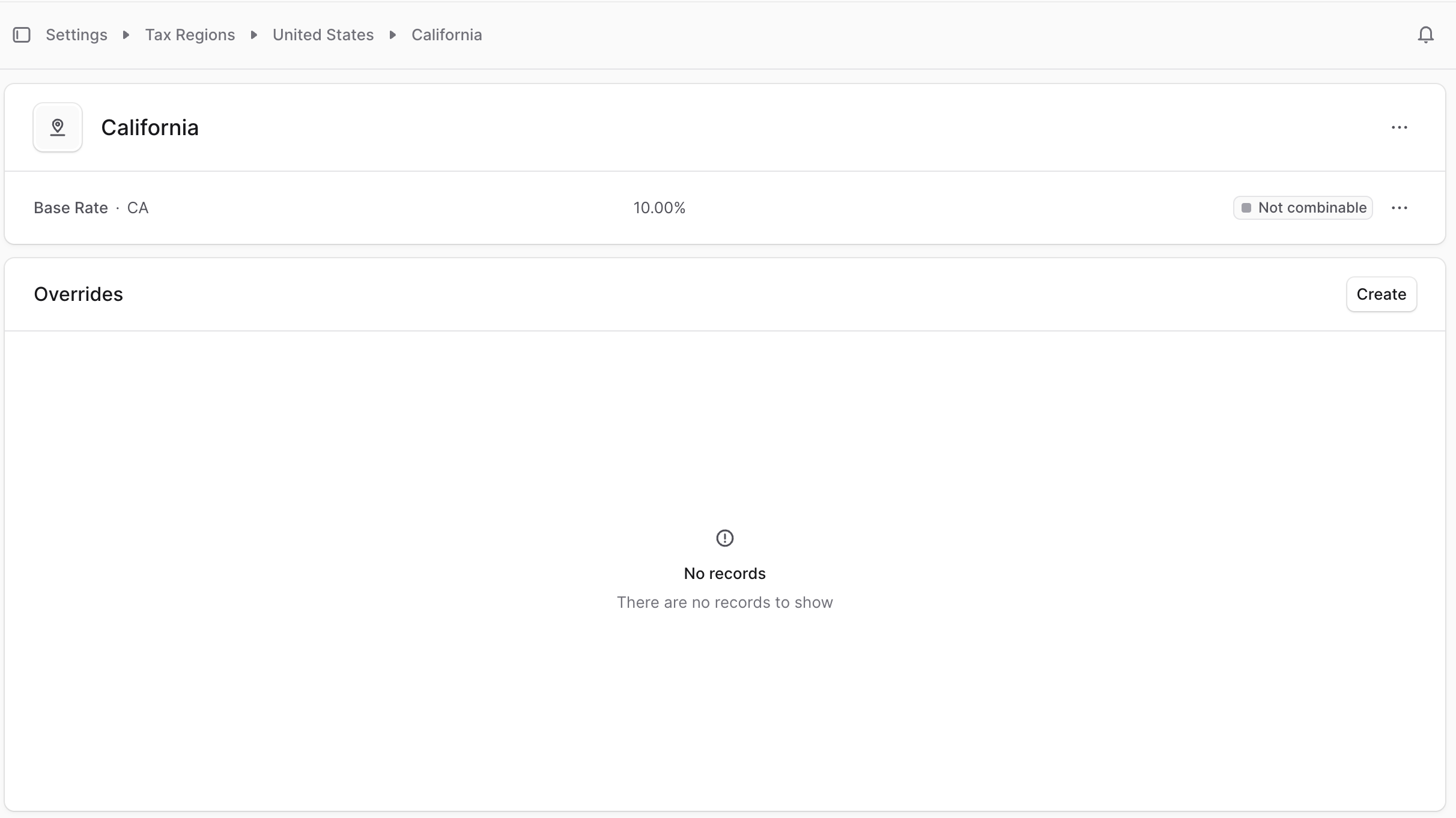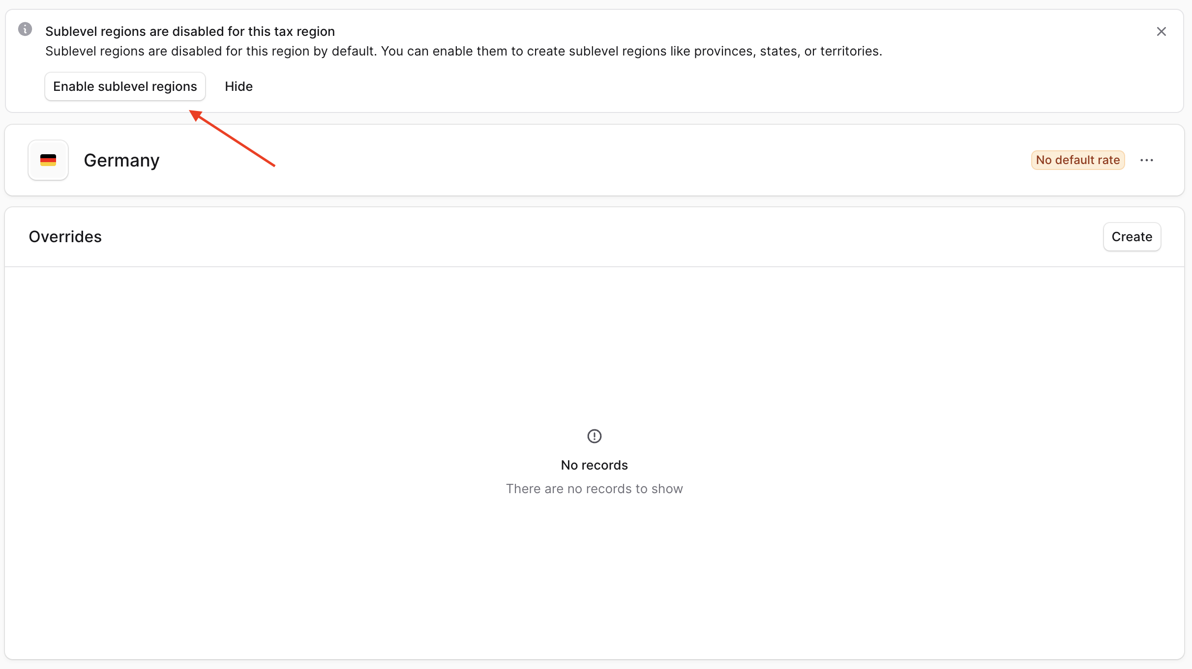 Tax regions for some countries like the United States have a States, Province, or Cantons section in the tax region details page. Here, you can add sublevel regions for the country.You can also enable it for other countries that don’t show this section by default. For those countries, you’ll find a note at the top of the page where you can enable the sublevel regions.After enabling this setting, you’ll find a “Sublevels” section in the tax region details page where you can add sublevel regions.