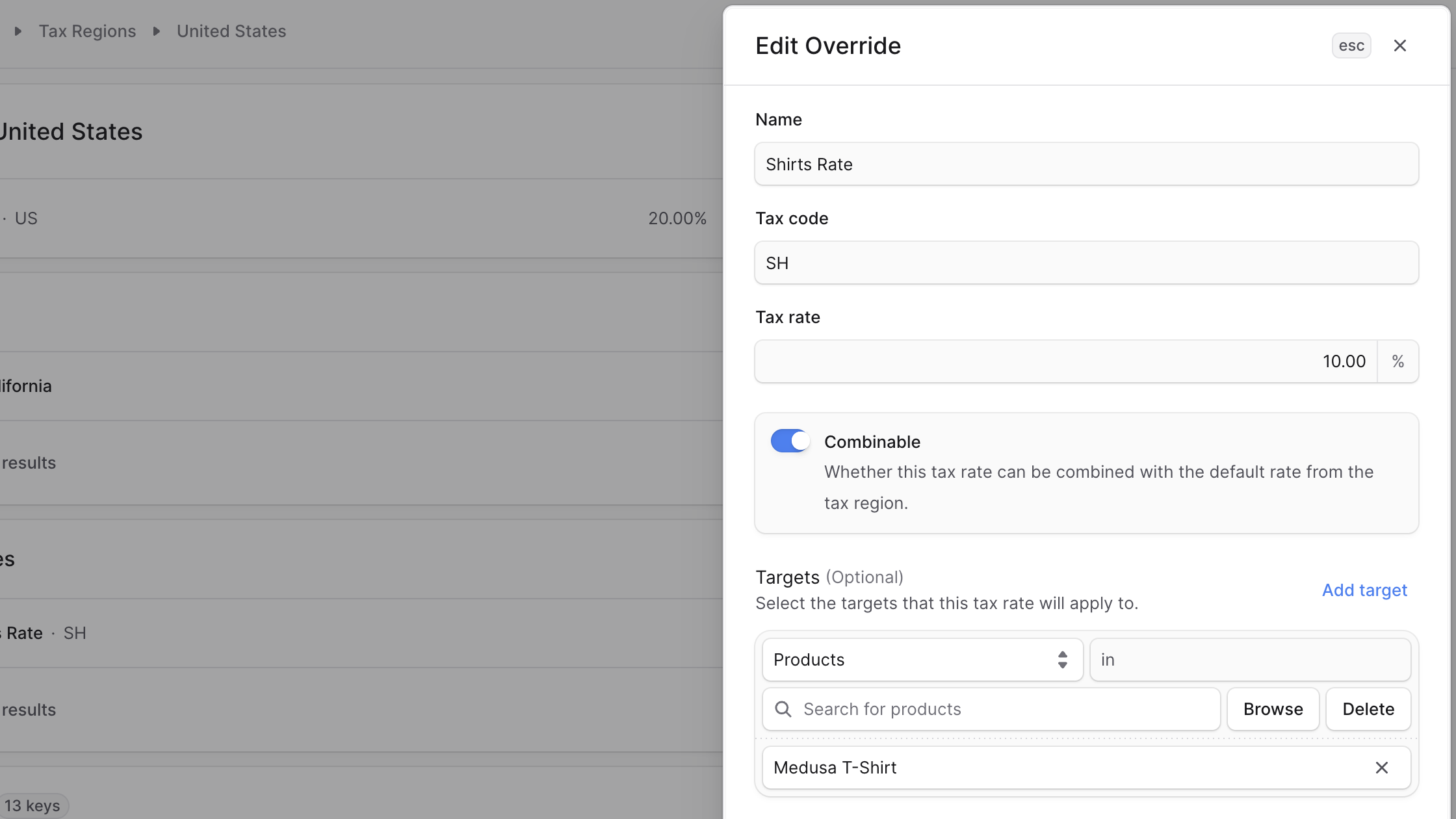 In the side window that opens, you can edit the override’s name, rate, code, and whether the tax rate should be combined with the default rate. You can also edit the targets of the override.