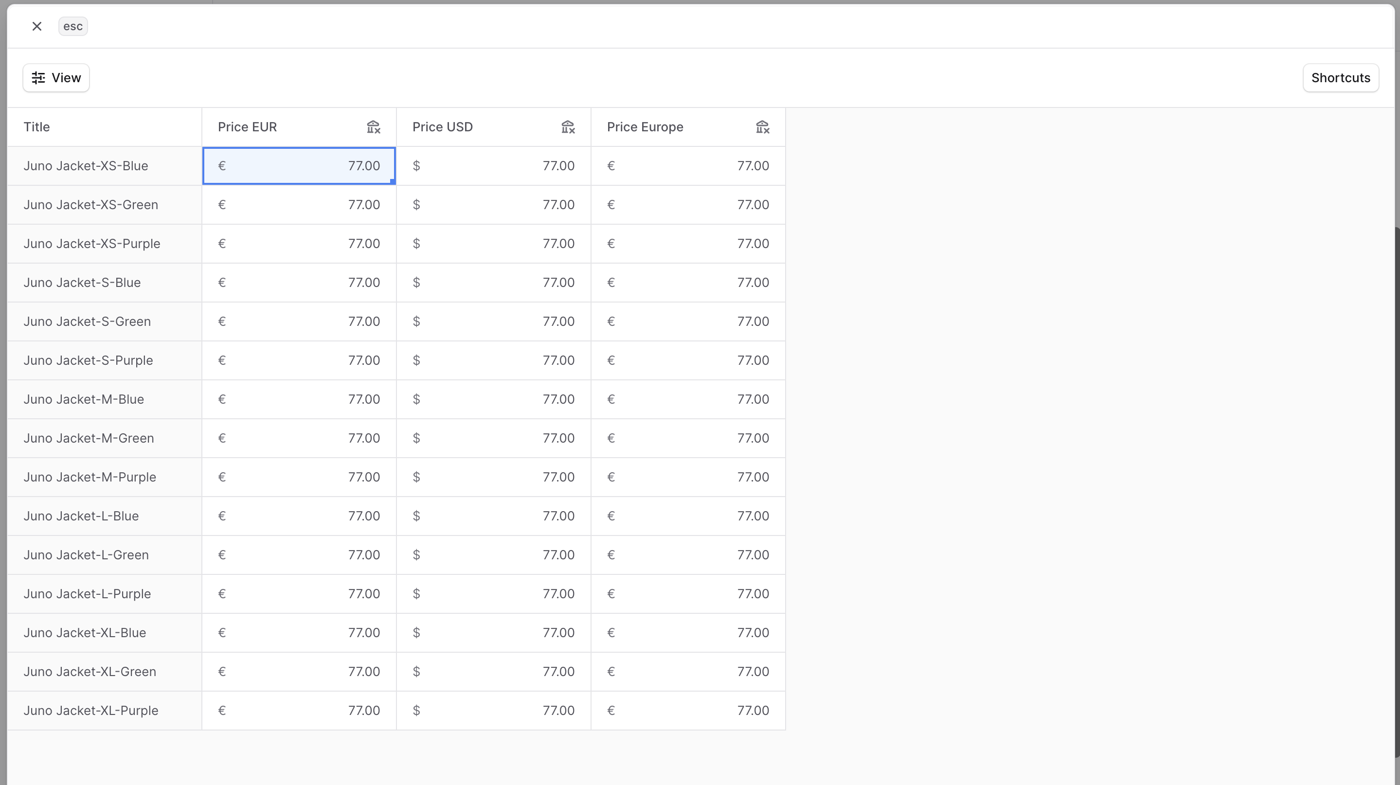 The bulk editor allows you to edit prices or values using a spreadsheet-interface. It simplifies the editing process when working with a large number of data, and provides you with an intuitive user experience.